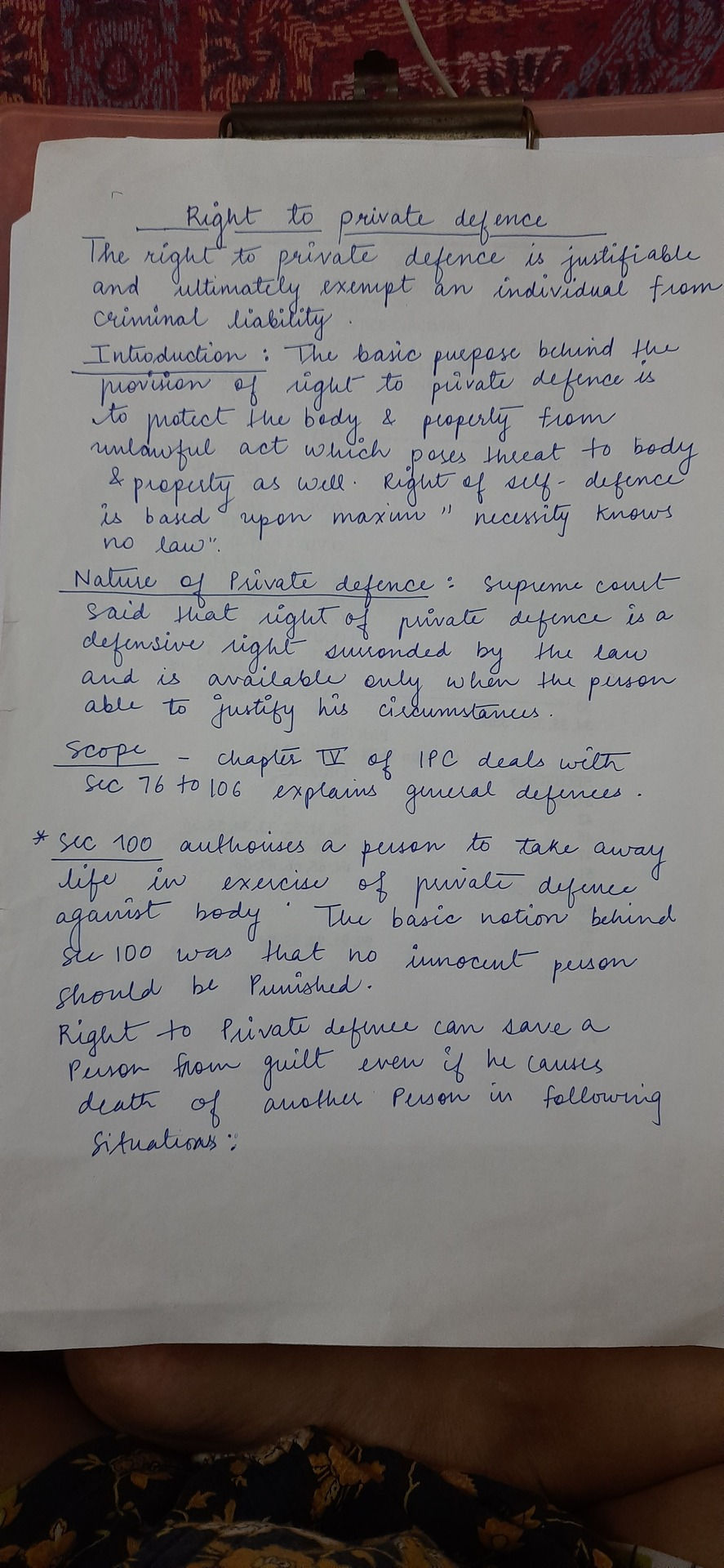 EXAMPLE | X try pull my dupatta down to plunder my chain away, I kick his bike to stop him. X falls down and gets hurt badly. Now I can claim right to private defense and I am not guilty.